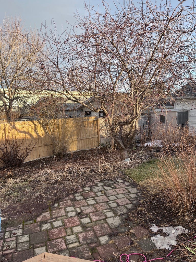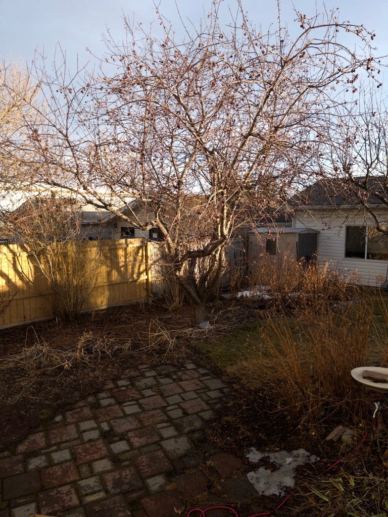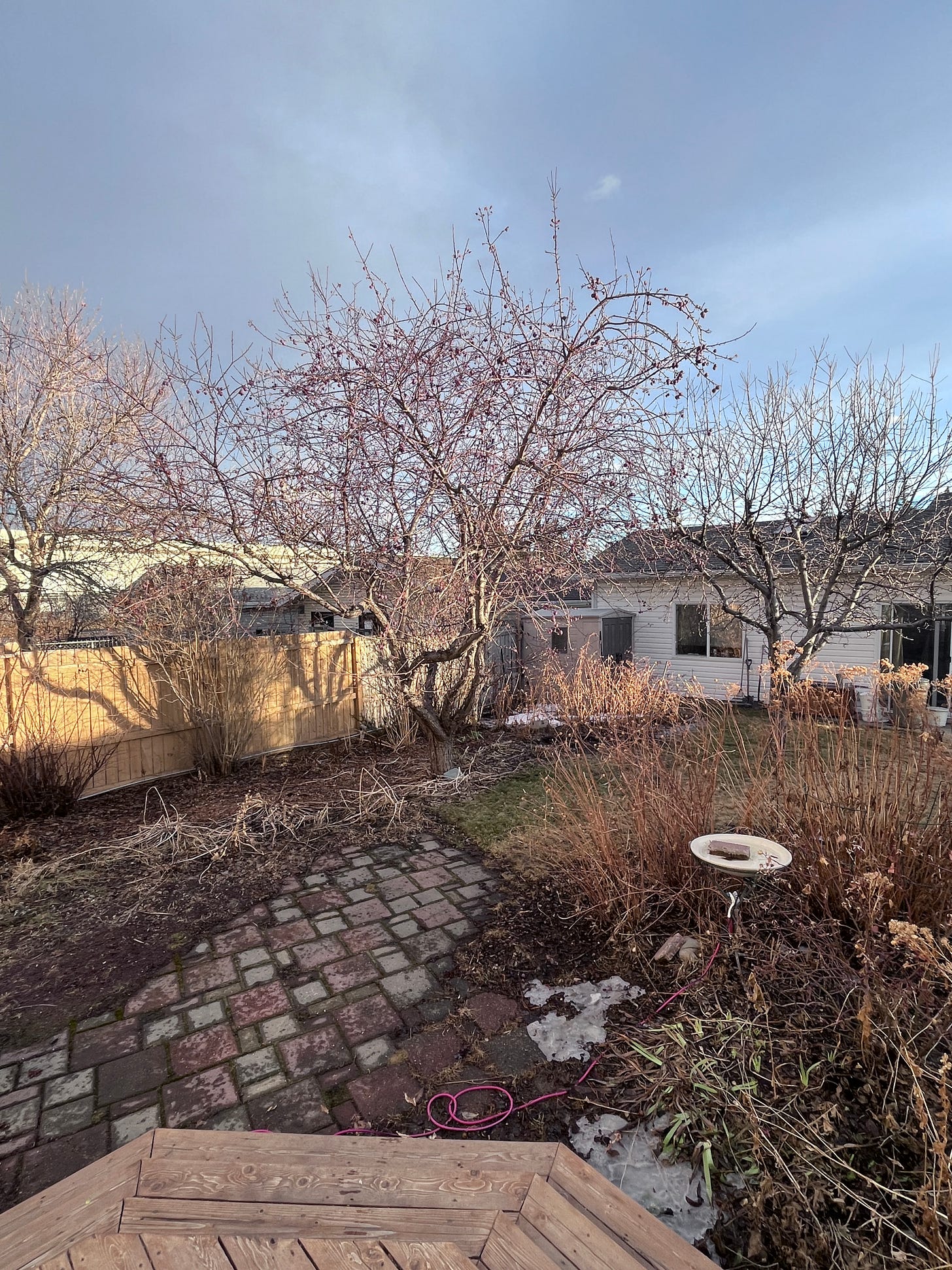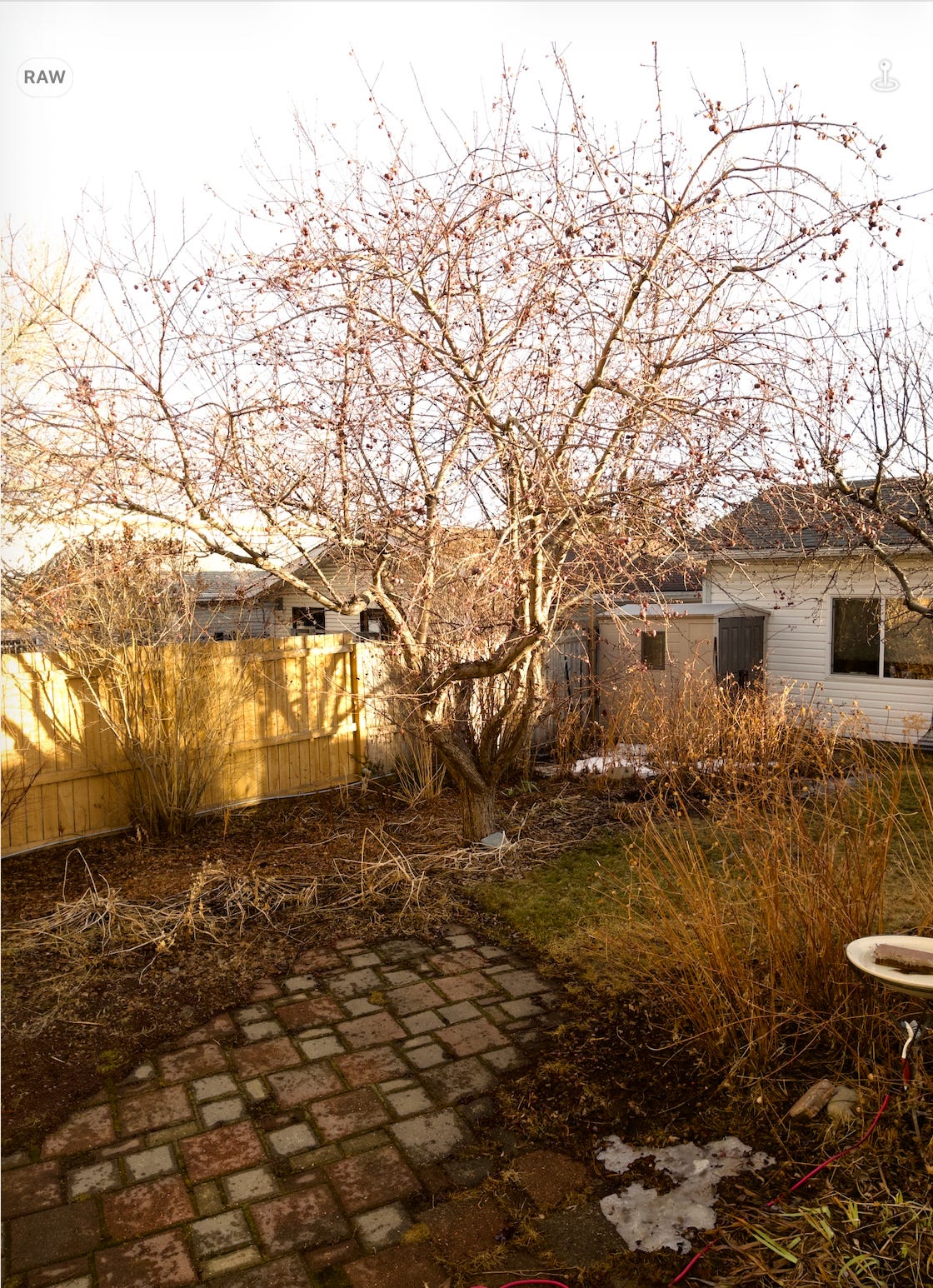 This next image was shot with Halide. This is an old school, unaltered image. It has the overall yellow flavour of the late afternoon sun and there’s an over-exposure problem on the illuminated fence. But, the branches and grasses aren’t as crunchy and eye catching as in the native camera shots.