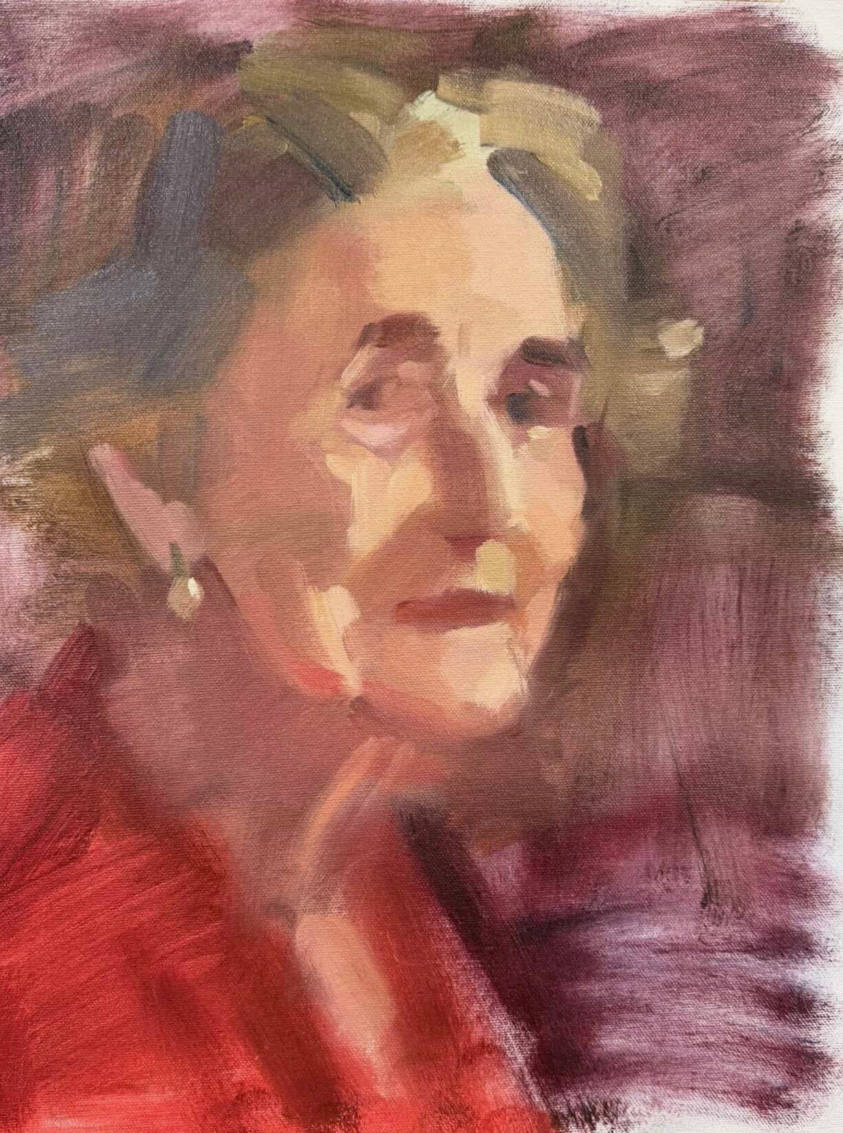 So when I paint people, I paint them the way that I see them. I have a broad, general view of faces in which eyes matter most and that’s what I paint, despite the extra information that’s available in a photo reference. Hence: don’t paint wrinkles! If you’re a dermatologist who paints, I think you might notice and paint lines but the rest of us can easily ignore them. What I paint is light, colour and form.